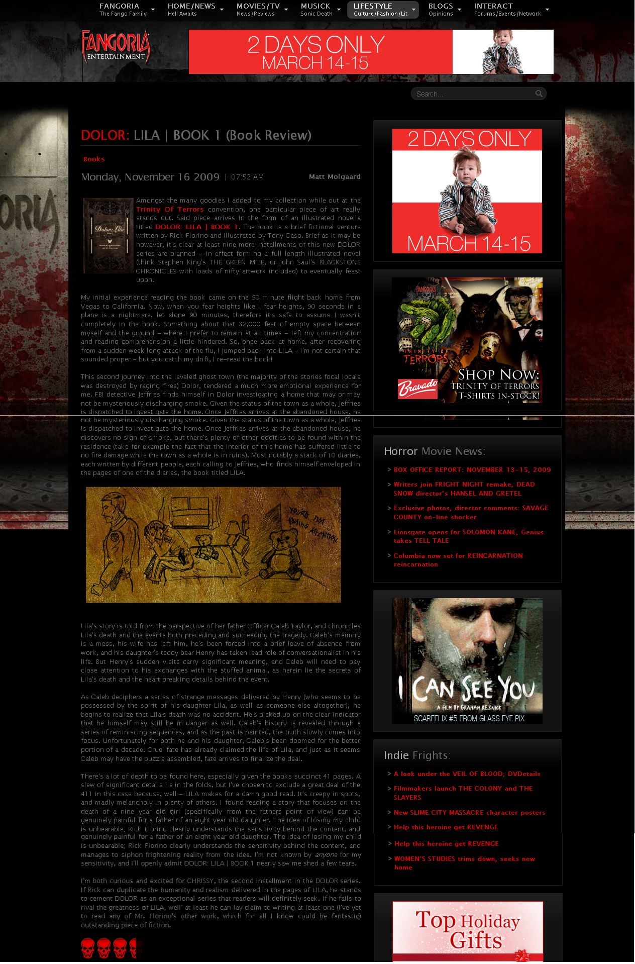 Fangoria posted a rave review of DOLOR: Lila! Matt Molgaard writes, "LILA makes for a damn good read. It's creepy in spots, and madly melancholy in plenty of others. Rick Florino clearly understands the sensitivity behind the content, and manages to siphon frightening reality from the idea...outstanding piece of fiction." Read the rest here!